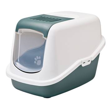 El aseo para gatos de la casa Nestor es fácil de limpiar. El frente especialmente desarrollado se abre de par en par, lo que permite retirar la arena para gatos sucia con cuidado y rapidez sin quitar la parte superior. La bandeja del Nestor tiene un respaldo elevado que evita fugas. Con tirador incorporado, puerta batiente de plástico y filtro de carbón.