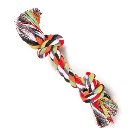 Mordedor de cuerda trenzada de algodón con dos nudos. Para adiestramiento canino o juegos de morder que ayudan en el mantenimiento de una buena salud dental. Medida: 40 cm.